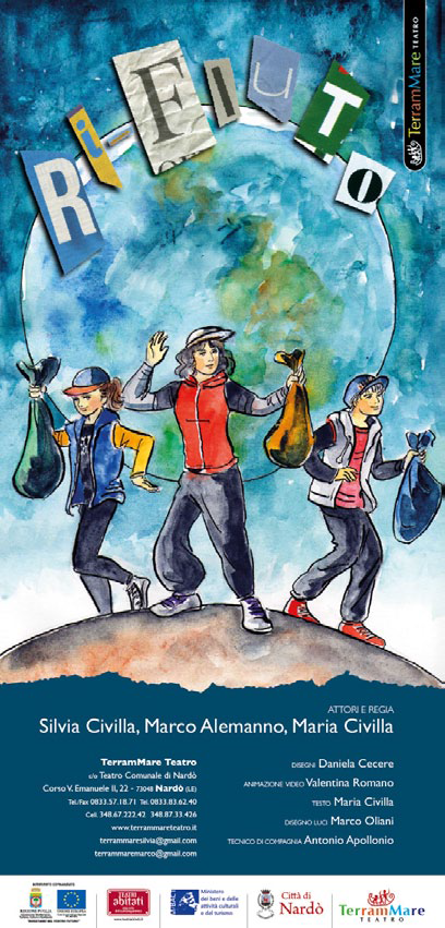 Ri-fiuto Testo di Maria Civilla. Attori e Regia Silvia Civilla, Marco Alemanno, Maria Civilla. Disegni e Video Daniela Cecere, Valentina Romano. Luci Marco Oliani - Tecnico Antonio Apollonio. Siamo in un futuro non molto lontano: una nonna racconta alla sua nipotina la storia di tre amici nati con un dono speciale, un fiuto incredibilmente fuori dalla norma! Grazie a questo anomalo "difetto", i tre avevano deciso di improvvisarsi super eroi metropolitani, per difendere la loro città - e magari il mondo intero - dall'invasione di rifiuti abbandonati nelle campagne, e per sensibilizzare l'umanità tutta sulla necessità di una coscienza in grado di valorizzare e tutelare il nostro povero, bellissimo eppure maltrattato pianeta Terra! Per attuare il loro disegno, i tre ragazzi sfruttavano il loro fiuto infallibile e riportavano al mittente ogni tipo di schifezza inquinante non correttamente differenziata, nella speranza di rieducare quegli animi poco inclini ad apprendere l'arte del riciclo. La tematica affrontata nello spettacolo (oltre a quella del valore dell'amicizia) è quella dei rifiuti, non solo intesi come spazzatura ma anche come rifiuti sociali o come il sentirsi rifiutati dagli altri, specie nella difficilissima fascia d'età adolescenziale. Lo spettacolo, seppur con ironia, racconta di ineducate abitudini e inutili sprechi, anche attraverso un linguaggio pensato appositamente per le nuove generazioni: il testo - sorprendentemente scritto da una ragazza di 12 anni, presente anche in scena - contiene numerosi spunti di riflessione su tematiche molto vicine al mondo giovanile.