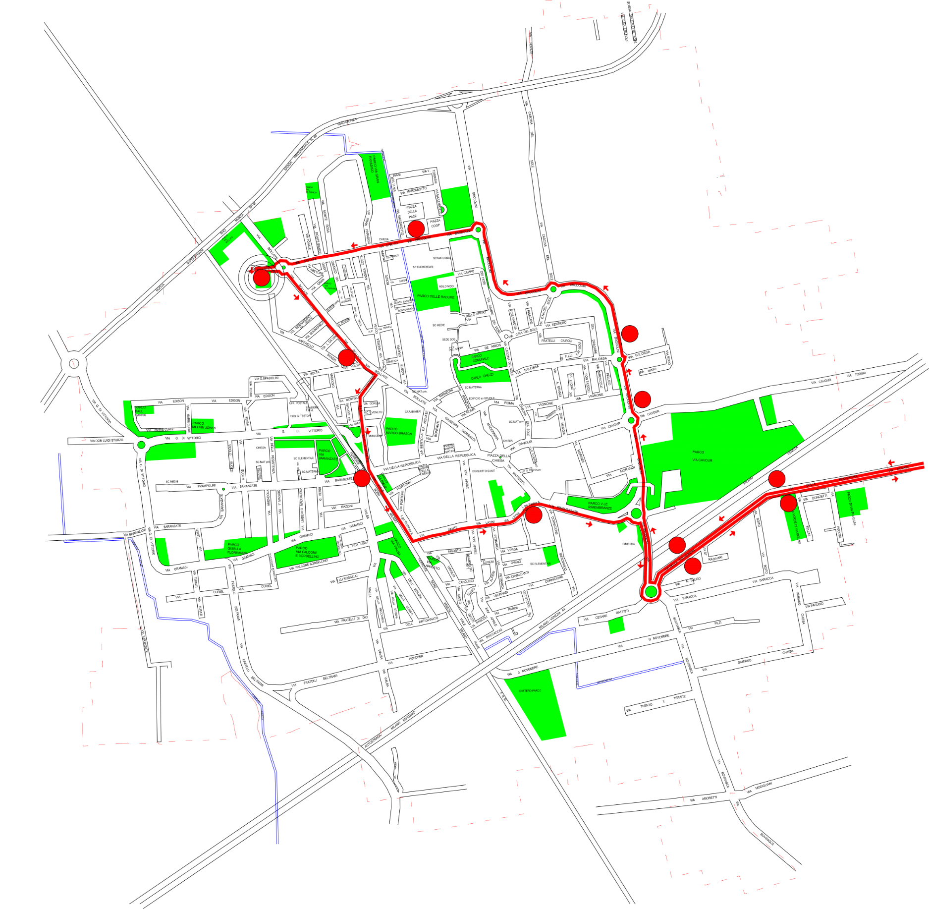 Zona via Matteotti - Cavour: il traffico locale che proviene da via Rimembranze e diretto in centro potrà percorrere via Matteotti fino all'intersezione con vicolo San Protaso e lì, svoltando a destra, proseguire in direzione di via Cavour - via Cascina del Sole o svoltare a sinistra in direzione di piazza della Chiesa dove sarà possibile percorrere via Matteotti in uscita dal centro Paese. E' altresì consentito proseguire in via Matteotti fino a piazza della Chiesa unicamente per invertire il senso di marcia ed effettuare il carico e scarico. Il tratto di via Cavour compreso tra piazza della Chiesa e vicolo San Protaso sarà percorribile solo in direzione di piazza della Chiesa (senso di marcia contrario all'attuale). La fermata della linea di autobus 89 dell'Atm e di AirPullman in piazza della Chiesa sono soppresse (la fermata più vicina - della linea 89 - per andare in direzione del capolinea di via Bollate 75 sarà quella situata in via Brodolini tra il supermercato In's e il distributore di benzina).