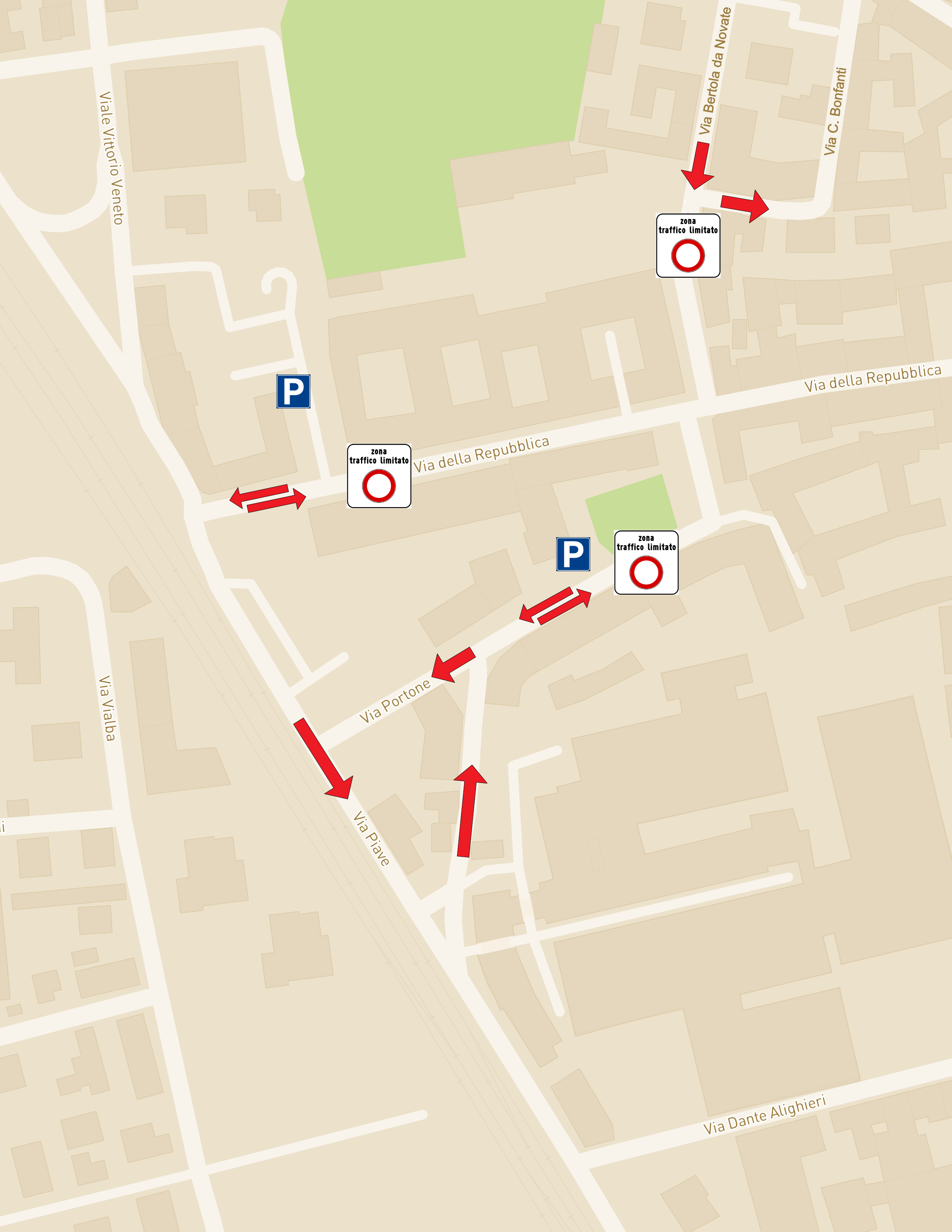 E' confermata la Ztl per i residenti e le persone autorizzate nell'area compresa tra via Portone, piazza Martiri della Libertà, primo tratto di via Bertola (fino a via Bonfanti) e via Repubblica (da piazza Martiri della Libertà al civico 114).